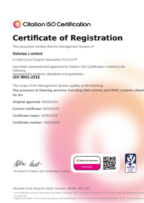 At Delotas Ltd, we help clients achieve and maintain the highest benchmark standards in cleanroom and data centre cleanliness. With over 20 years of experience, we provide specialist cleaning services across the UK, covering data centres, server rooms, and technical environments. Our team ensures compliance with the strictest international standards, including: